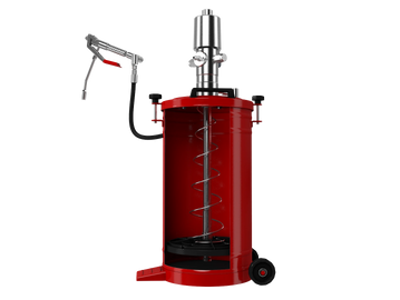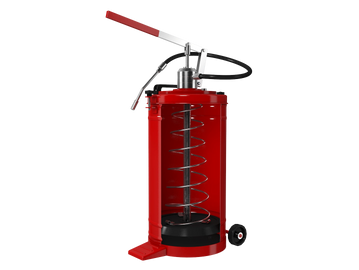 This pump, which has a capacity of 10 Kg works mechanically. Ideal for short distance high pressure lubrication. Hydraulic hoses are used, two wheels make it easy to move, through follower plate and spring pressing the grease in the reservoir is compressed and the pump feed is more easily in high viscosity greases and cold areas also.